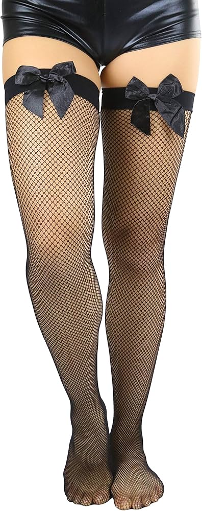 Tobeinstyle Women S Fishnet Thigh High With Satin Bow Stockings Tights Hosiery Black With Black Bow One Size Regular At Amazon Women S Clothing Store